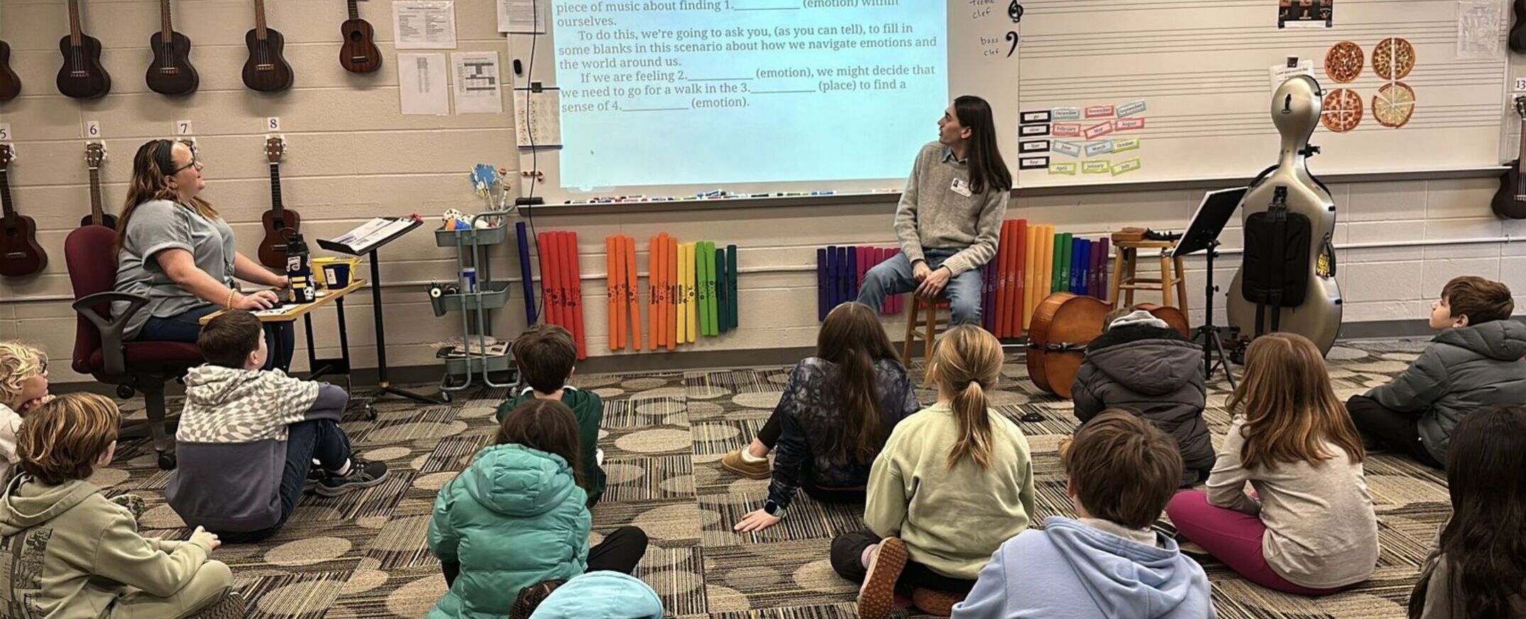 Bryce Kessler visits with 4th grade students at Summit Elementary to complete a class mad-lib about music and mindfulness. Photo by GreenCraft Media.