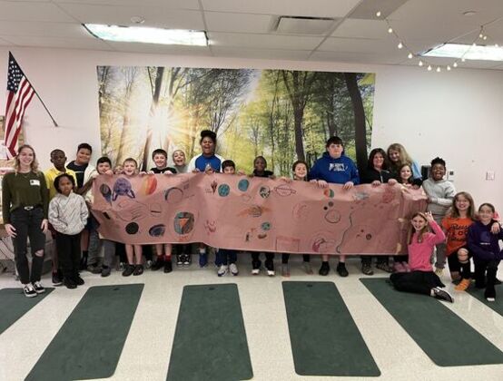 Charli stands with a class of smiling students holding up a long sheet of paper with their galaxy drawings.