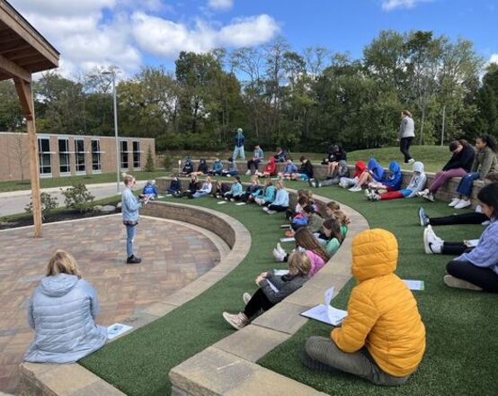 Charli leads 5th grade students in a sun salutation, stretching their hands to the sky in an outdoor ampitheatre classroom